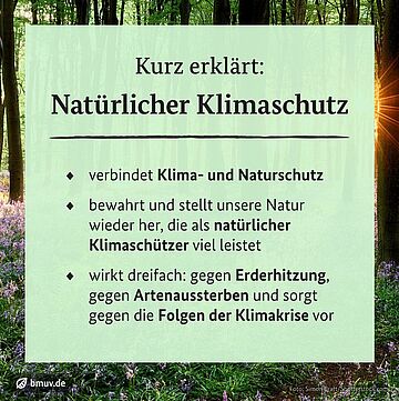 Intakte Ökosysteme sind natürliche Klimaschützer. Wälder und Auen, Böden und Moore, Meere und Gewässer, naturnahe Grünflächen in der Stadt und auf dem Land binden Kohlendioxid (CO2) aus der Atmosphäre und speichern es langfristig. Natürlicher Klimaschutz verbindet den Schutz von Klima und Natur.