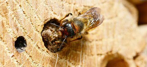 - Manche Wildbienen und Wespen legen ihre Brutkammern mit Hohlräumen in Holz, in Stängeln und in der Erde an. In Holz und Stängeln nistende sogenannte Solitärbienen können durch spezielle Nisthilfen gefördert werden. Arten, die im Boden nisten, profitieren von freien Bodenstellen und dem Verzicht auf flächendeckendes Mulchen im Garten im Frühling und Sommer. In der kalten Jahreszeit sind Quartiere für die kleinen Insekten überlebenswichtig. Auch Trockenmauern aus Bruch- oder Natursteinen, Kräuterspiralen und Steinhaufen sind ebenfalls als Winterquartiere beliebt.