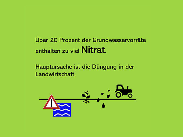 Hinzu kommt, dass Stickstoff und Pflanzenschutzmittel aus der Landwirtschaft einen erheblichen Teil der Oberflächengewässer und des Grundwassers belasten. Wegen des hohen Nitratgehalts sind mehr als 20 Prozent der Grundwasserkörper in Deutschland in einem schlechten chemischen Zustand.