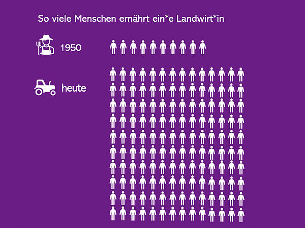 Die Landwirtschaft spielt eine wichtige Rolle für uns Menschen: Sie sichert unsere Ernährung und damit unsere Lebensgrundlage. Dabei hat sie sich im Laufe der Zeit weiterentwickelt und ihre Produktivität enorm gesteigert. Während im Jahr 1950 zehn Menschen mit den Erzeugnissen eines Landwirts beziehungsweise einer Landwirtin versorgt werden konnten, waren es im Jahr 2019 bereits 137 Menschen.
