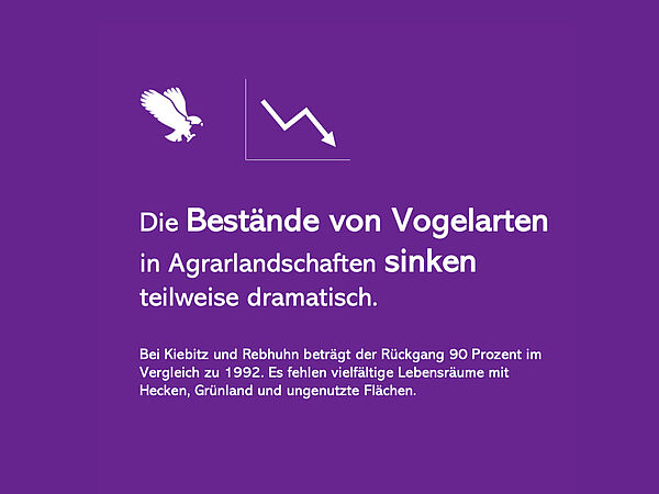 Die Intensivlandwirtschaft verursacht eintönige Agrarlandschaften. Für wildlebende Tiere bieten diese kaum noch Nahrung oder Brut- und Rückzugsräume. Landschaftselemente wie Wiesen, Hecken, Weiher oder Ackerrandstreifen wurden häufig entfernt. Doch gerade diese Elemente sind wichtig für die biologische Vielfalt.