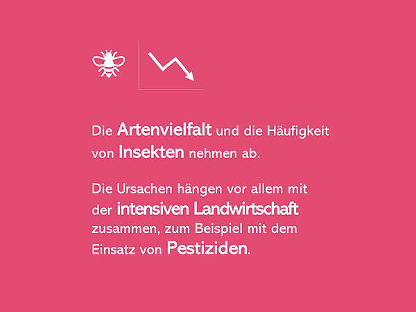 Zudem sind Pestizide in der konventionellen Landwirtschaft weit verbreitet. Sie gelten als eine Hauptursache für das Insektensterben. Insekten wiederum sind Nahrungsgrundlage für viele andere Tiere, zum Beispiel vieler Vögel. Geht das Nahrungsangebot zurück, hat das auch einen Rückgang der Vogelbestände zur Folge. Hinzu kommt, dass sich die chemischen Pflanzenschutzmittel im Boden anreichern und dort die Fruchtbarkeit beeinträchtigen. Daher ist wichtig, dass zum Schutz der Umwelt Leitlinien für Stoffeinträge entwickelt werden.