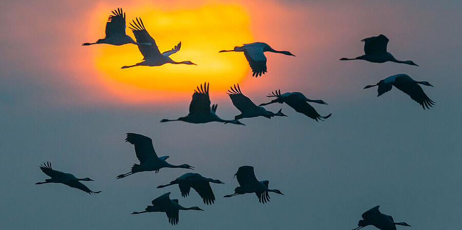 Ist der Winter besonders mild beziehungsweise warm, bleiben die Kraniche auch teilweise lange in Deutschland. Wenn sie aber losfliegen, dann sieht das meist sehr eindrucksvoll aus. Sie sammeln sich im Oktober und November an ihren Treffpunkten, um dann in riesigen V-Formationen gemeinsam loszufliegen. In einem Dorf in der Nähe von Stralsund in Mecklenburg-Vorpommern treffen sich manchmal bis zu 70.000 Kraniche zu ihrer gemeinsamen Reise.