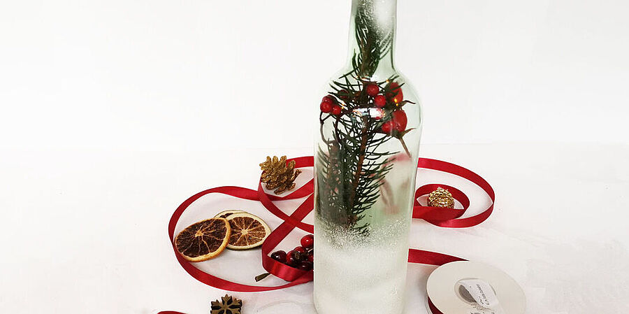 Jetzt kannst du kreativ werden! Befülle die Flasche zum Beispiel mit weihnachtlichen Zweigen, Zimtstangen, kleinen Weihnachtskugeln und kleinen Zapfen. Deiner Kreativität sind keine Grenzen gesetzt.