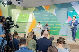 Auf dem Event der IKI im Deutschen Pavillon diskutierte Carsten Schneider, wie die Klimazusagen in konkrete Maßnahmen umgesetzt werden. Thematisiert wurde außerdem, wie robuste Klimastrategien die wirtschaftliche Entwicklung unterstützen und durch die Festlegung klarer politischer Rahmenbedingungen Möglichkeiten für nachhaltige Investitionen schaffen. Zudem war das Event der Startschuss für die neue Förderrunde der IKI.