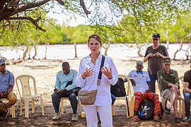 Beim Besuch eines Projektes spricht sie über deutsche Klimaanpassungsbemühungen.