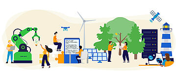 Illustration zu Themen der Digitalisierung: Menschen im Kontext zu Drohnen, Robotik und  nachhaltige Energien